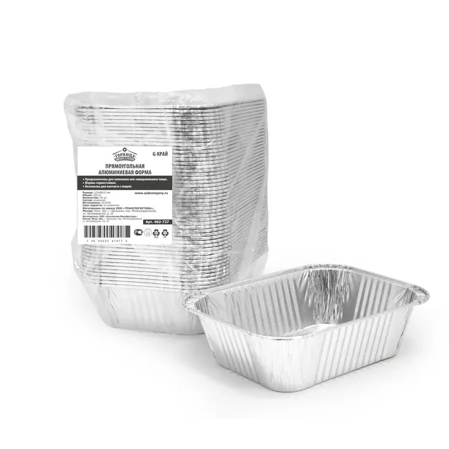 Форма алюминиевая прямоугольная с крышкой из высококлассной пищевой фольги. Предназначена для хранения, заморозки, разогрева и запекания мяса, рыбы, овощей и других продуктов. Может использоваться для приготовления пищи в СВЧ или духовом шкафу, подходит для глубокой заморозки. Благодаря тому, что металлическая фольга долгое время сохраняет тепло, форма подходит для доставки горячей еды.