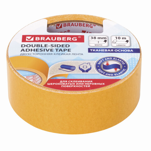 Клейкая двухсторонняя лента 38мм х 10м, ТКАНЕВАЯ ОСНОВА, BRAUBERG, 606428