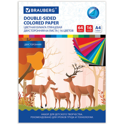 Набор двусторонней мелованной цветной бумаги BRAUBERG предназначен для творчества и хобби и может использоваться детьми с трехлетнего возраста. Бумага рекомендована для уроков труда и технологии. Творческая инструкция по созданию аппликации на обороте. Набор двусторонней цветной бумаги на склейке, плотностью 65 г/м2 включает 64 листа формата А4 (200х280 мм) в 16-ти разнообразных и насыщенных однородных цветах. Листы, легко режутся и сгибаются.