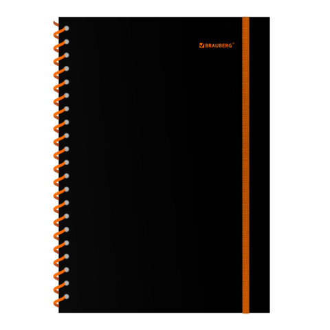 Тетрадь обложка пластик, А4 80л. спираль пластик, резинка, клетка, BRAUBERG, черный/оранжевый, 405382