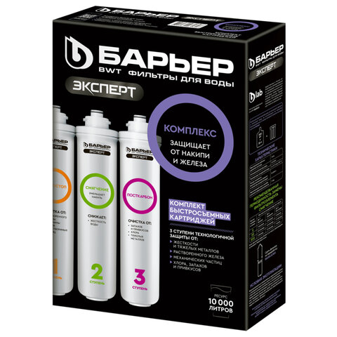 Комплект сменных картриджей «БАРЬЕР ЭКСПЕРТ Комплекс» — это мощное решение для домов и дач, где вода одновременно жёсткая и насыщена железом: она оставляет белый налёт в чайниках, рыжий осадок на посуде и придаёт напиткам неприятный металлический привкус. Сменные быстросъемные картриджи для проточного фильтра БАРЬЕР ЭКСПЕРТ. Комплект сменных картриджей БАРЬЕР ЭКСПЕРТ Комплекс позволяет забыть о накипи, неприятном металлическом привкусе воды и желтоватом осадке в чайнике. Производительность — 2 л/мин. Ресурс — 10 000 литров.