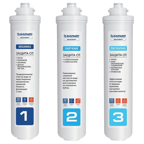 3."БАРЬЕР ЭКСПЕРТ ПостКарбон" - финишная очистка и кондиционирование, устранение неприятных привкусов и остаточного хлора. Ресурс - 10 000 литров.