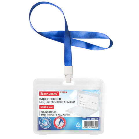 Горизонтальный бейдж BRAUBERG EXTRA для именной карточки предназначен для идентификации сотрудников в компаниях, а также на семинарах, тренингах, презентациях и других мероприятиях. Бейдж с увеличенной вместимостью на 2 карты и лентой 45 см. Изготовлен из жесткого пластика, гарантирующего долгий срок службы и защищающего от влаги и пыли Вашу именную карту. Идеально подойдёт для чувствительных к механическим повреждениям магнитных карт и пропусков. Размер вкладыша 54х85 мм. Обратная сторона вкладыша подготовлена под персонализацию - фото, ФИО, должность и название компании.