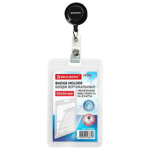 Вертикальный бейдж BRAUBERG EXTRA для именной карточки предназначен для идентификации сотрудников в компаниях, а также на семинарах, тренингах, презентациях и других мероприятиях. Бейдж с увеличенной вместимостью на 2 карты и держателем-рулеткой 70 см. Изготовлен из жесткого пластика, гарантирующего долгий срок службы и защищающего от влаги и пыли Вашу именную карту. Идеально подойдёт для чувствительных к механическим повреждениям магнитных карт и пропусков. Размер вкладыша 85х54 мм. Обратная сторона вкладыша подготовлена под персонализацию - фото, ФИО, должность и название компании.