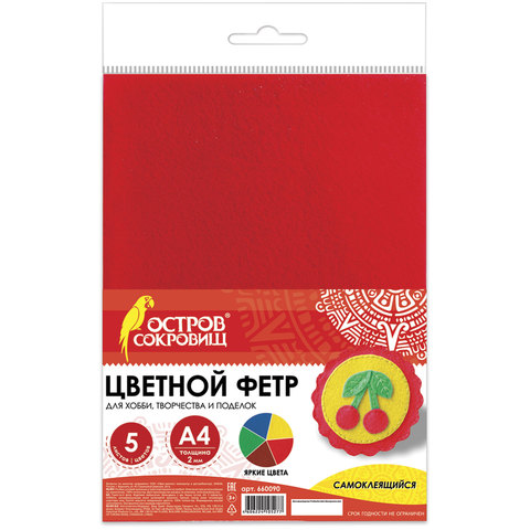 Цветной фетр для творчества, А4, ОСТРОВ СОКРОВИЩ, самоклеящийся, 5 листов, 5 цветов, толщина 2 мм, 660090