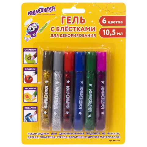 Гель с блестками ЮНЛАНДИЯ, для декора, поделок, DIY, творчества, оформления, 6 ярких цветов по 10,5 мл, блистер, 662249