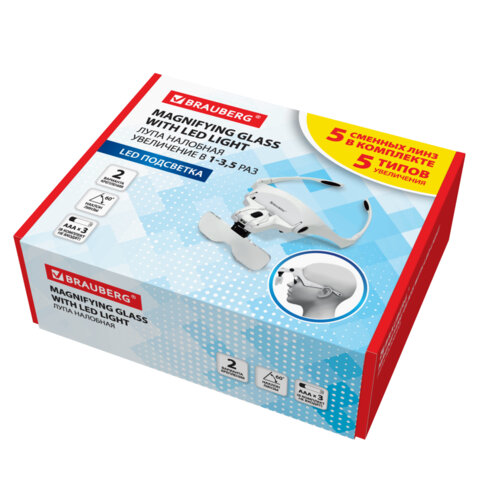 Лупа налобная с LED ПОДСВЕТКОЙ, 5 сменных линз 95х33 мм, увеличение 1,0 - 3,5, BRAUBE, 455929