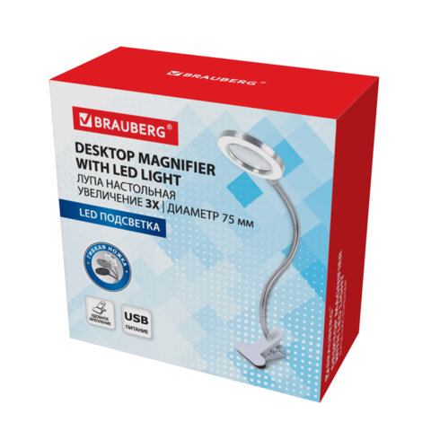 Лупа настольная BRAUBERG с подсветкой предназначена для чтения, просмотра карт, мелких рисунков, шкал, схем, в том числе при отсутствии света или слабом освещении. Усовершенствованная технология освещения, комфортное увеличение. Корпус изделия изготовлен из металла. Крепится к поверхности при помощи прищепки. Гибкая ножка, несколько углов вращения. Регулируемый угол наклона. Увеличение линзы 3х, диаметр 75 мм. Подключается устройство к источнику питания при помощи USB кабеля.