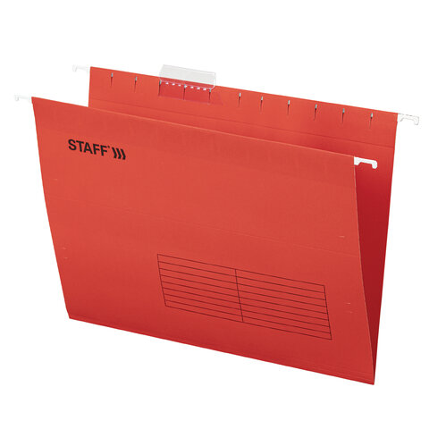 Подвесные папки формата A4 STAFF предназначены для размещения в подвесной регистратуре (по бокам имеются специальные крючки). Позволяют организовать хранение данных большой информационной базы. Папки V-образной формы изготовлены из высококачественного картона красного цвета плотностью 200 г/м2 и металлических крючков. Обладают повышенной прочностью. Вместимость до 80 листов. Размер папки без крючков составляет 310х240 мм, а с крючками - 350х240 мм. В комплект входят 10 папок, а также 10 прозрачных пластиковых табуляторов с ярлычками.