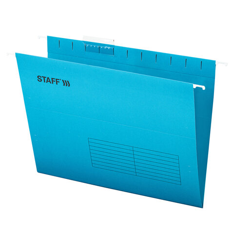 Подвесные папки формата A4 STAFF предназначены для размещения в подвесной регистратуре (по бокам имеются специальные крючки). Позволяют организовать хранение данных большой информационной базы. Папки V-образной формы изготовлены из высококачественного картона синего цвета плотностью 200 г/м2 и металлических крючков. Обладают повышенной прочностью. Вместимость до 80 листов. Размер папки без крючков составляет 310х240 мм, а с крючками - 350х240 мм. В комплект входят 10 папок, а также 10 прозрачных пластиковых табуляторов с ярлычками.