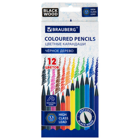 Карандаши цветные BRAUBERG, 12 цветов, черное дерево, грифель мягкий 3,3 мм, 181856