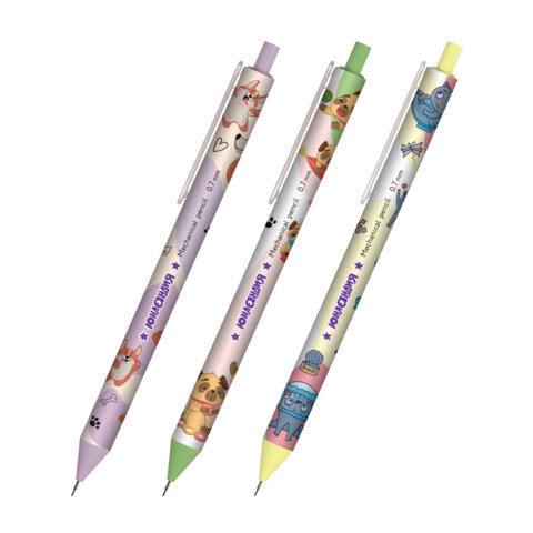 Карандаш механический 0,7 мм с принтом, ЮНЛАНДИЯ "CUTE PETS", корпус soft-touch ассорти, 182061