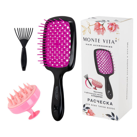 Расческа MONTE VITA – это не просто аксессуар, а незаменимый инструмент для ухода за волосами. Применяется для массажа головы, расчесывания волос, создания прически. Набор для домашнего ухода: продувная черно-розовая расческа из ABS-пластика, массажер для головы и щеточка.