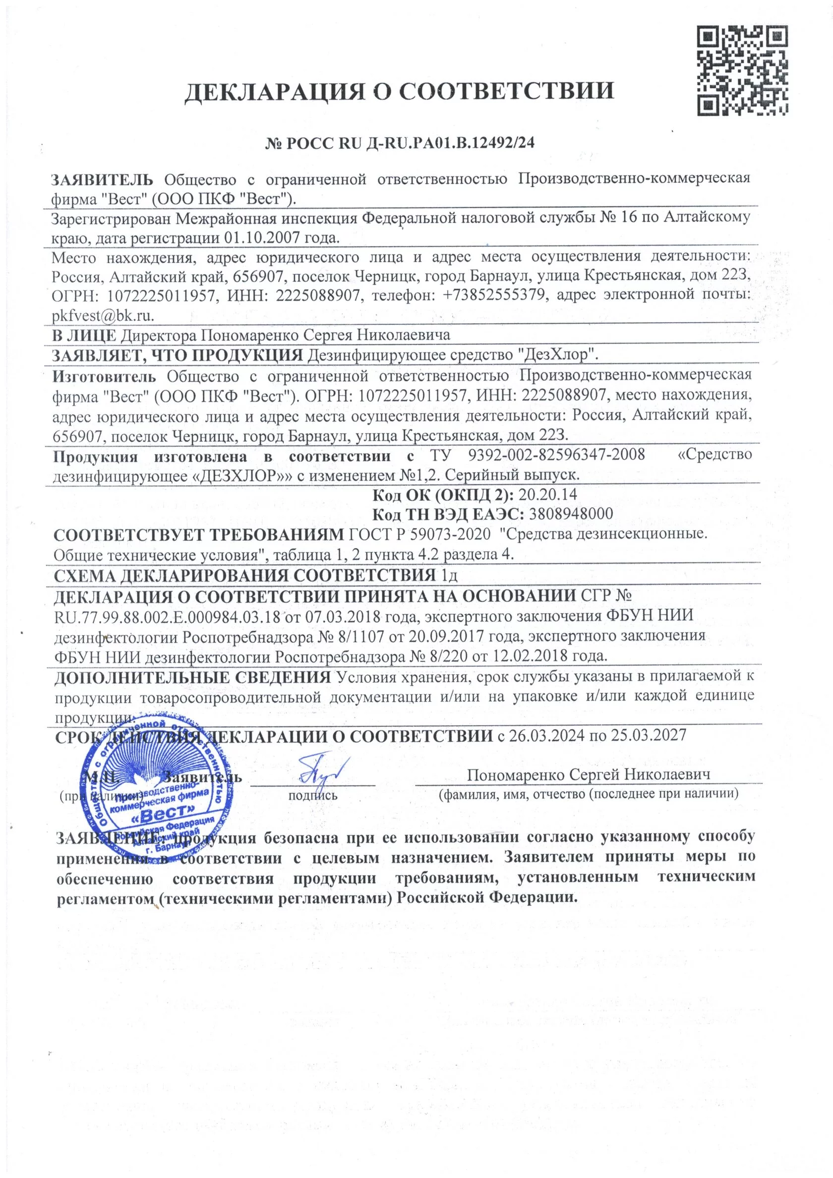 Дезинфицирующее средство ДЕЗХЛОР с широким спектром действия в форме хлорных таблеток Содержит в качестве действующего вещества натриевую соль дихлоризоциануровой кислоты, а также ПАВ, что придает растворам средства моющий эффект. Выпускается в виде таблеток белого цвета с хлорным запахом и массой 3,35 г.