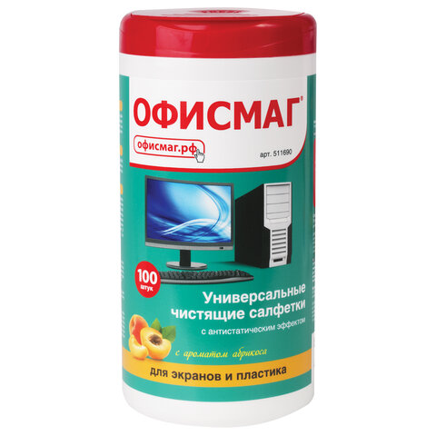 Салфетки для экранов всех типов и пластика ОФИСМАГ с ароматом "АБРИКОС", туба 100 шт., влажные, 511690