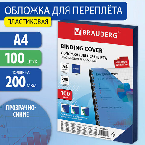 Пластиковые обложки BRAUBERG придадут документам эстетичный внешний вид и защитят от повреждений. Предназначены для переплета документов брошюровщиком с помощью пластиковых и металлических пружин. Выполнены из прочного, износостойкого прозрачно-синего пластика плотностью 200 мкм. Имеют глянцевую текстуру. Подходят для документов формата А4. 100 штук в комплекте.