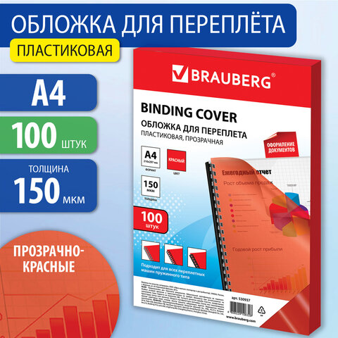 Пластиковые обложки BRAUBERG придадут документам эстетичный внешний вид и защитят от повреждений. Предназначены для переплета документов брошюровщиком с помощью пластиковых и металлических пружин. Выполнены из прочного, износостойкого прозрачно-красного пластика плотностью 150 мкм. Имеют глянцевую текстуру. Подходят для документов формата А4. 100 штук в комплекте.