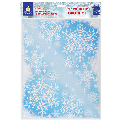 Украшение для окон и стекла ЗОЛОТАЯ СКАЗКА - это отличный и недорогой способ украсить домашний или офисный интерьер к новогодним праздникам. Такой декор наполнит комнату волшебной атмосферой и подарит праздничное настроение. Изделие с зимним тематическим изображением в виде снежинок представляет собой наклейку на окно/стекло, изготовленную из поливинилхлорида (ПВХ). Наклейка размером 30x38 см декорирована голубым и белым глиттером. Украшение предназначено для декорирования окон, зеркал, стекол и других ламинированных глянцевых поверхностей. Не оставляет клеевых следов и предназначено для многократного использования. Крепится к поверхности посредством статического эффекта. Украшение на белой картонной подложке упаковано в прозрачный полипропиленовый пакет на картонном подвесе.