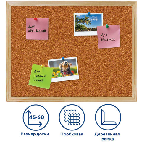Доска пробковая для объявлений 45х60 см, деревянная рамка, ГАРАНТИЯ 10 лет, РОССИЯ, BRAUBERG, 236859
