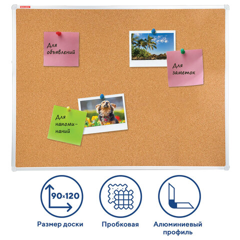 Доска пробковая для объявлений 90х120 см, алюминиевая рамка, ГАРАНТИЯ 10 ЛЕТ, РОССИЯ, BRAUBERG, 236445