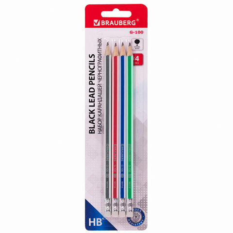 Набор карандашей чернографитных BRAUBERG "G-100" 4 шт., HB, с ластиком, корпус ассорти, 181715