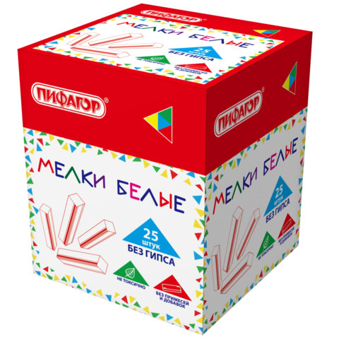Мел ПИФАГОР предназначен для письма и рисования на классных и аудиторных досках, а также на любых шероховатых поверхностях. Изготовлен из высококачественного природного сырья без примесей. Не содержит твердых включений и не портит поверхность досок. Обеспечивает мягкое письмо. Не оставляет царапин. Легко смывается водой.